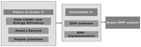 Achieving a green ERP system in a company requires more than merely using IT in practices that involve measures of the development of greener applications and business transformation in adopting green initiatives [42]. Logically, organizations should align their IT with sustainable development [43]. The term “green IT” is now generally accepted as a system that embeds practices, initiatives, and measures with the final goal of reducing the negative impact of IT on the environment. Although there are many approaches in terms of its scope and coverage [44,45], green IT has become a necessity in IT management, being the first step toward the overall goal of sustainability. IT enables the creation of greener and sustainable development with a focus on the efforts of an organization in three directions [22]: (1) make IT systems and their use greener, (2) use IT in several ways to improve environmental sustainability in different areas of business activities, and (3) use IT in innovative ways to create awareness and promote sustainability among the employees and stakeholders. Studies have indicated that green IT aims to achieve economic viability and improved system performance and use, in accordance with an organization’s social and ethical responsibilities. Thus, green IT incorporates the dimensions of environmental sustainability, the economics of energy efficiency, and the total cost of ownership, which includes the cost of disposal and recycling [21]. To address the environmental impact of IT, Murugesan’s green IT definition focuses on a holistic approach to the tangible IT hardware, including the problems along four complementary paths: such are green use, green disposal, green design, and green manufacturing [21]. However, this definition lacks organizational perspective. According to Molla [46], the adoption of green technologies involves technological, organizational, and environmental contexts that are inherent when creating economic and environmental value. Another approach revealed that green IT provides a socio-technical perspective on the diverse complex phenomena of organizational sustainability [47].