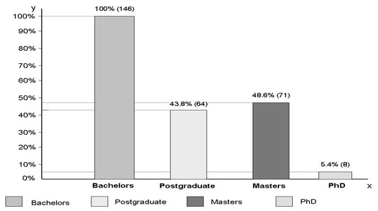 Concerning the level of education, the data revealed that all 146 respondents had a bachelor’s degree (100%), 64 respondents had taken a postgraduate course (43.8%), 71 had Master’s degrees (48.6%), and eight had a PhD degree (5.4%) (Figure 4).