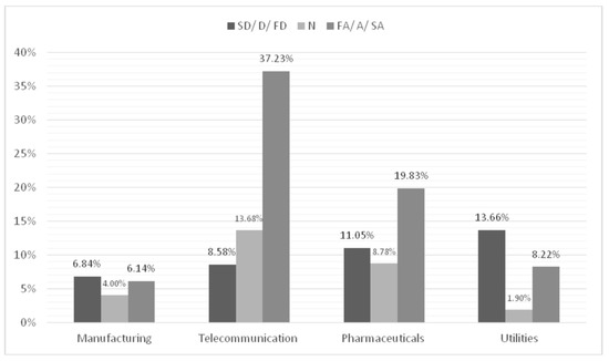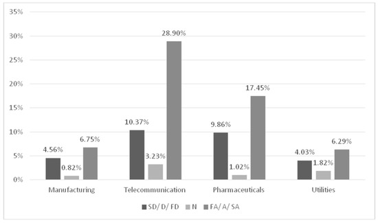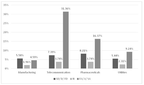Questions in this category were related to the software sustainability aspects of an ERP system in order to align with environmental requirements. By investigating the respondents’ attitudes through the Likert scale, we identified the level of agreement concerning the criteria that deal with sustainable ERP software. The overall level of agreement related to category 2 from the questionnaire on type of attitude (negative—SD/D/FD, neutral—N, and positive—FA/A/SA), for each economic sector are shown in Appendix B.