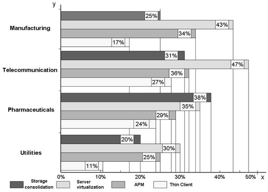 - Server virtualization. Widely adopted as a green IT initiative, virtualization enables data centers to consolidate their physical server infrastructure by hosting multiple virtual servers on a smaller number of more powerful servers, reducing the data center’s energy demands [21]. According to Barroso and Hölze [71], virtual servers use less power and have higher levels of efficiency than standalone servers. Although virtualization technology allows the reduction of power consumption by reducing the overall number of devices, in practice, most data centers’ power consumption continues to rise because the devices are becoming increasingly powerful and use more electricity. However, from a green IT perspective, this technology helps organizations to achieve some of the objectives of their environmental policy.