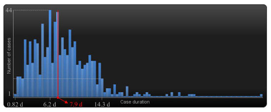 This section expounds the results that stem from the PM application. Figure 2 displays the approximate case duration, expressed in days, related to the number of cases. Globally, the 808 process instances involved 50 FFs, 10 Maritime Agencies, and five Terminals. About 95% of the cases show a time length within the 0.82–14.3 [days] range. The highest frequency of case occurrence (44) corresponds to a 6.2 days duration. The red vertical line marks the mean case duration (7.9 days) within the distribution. Therefore, an arc/activity is critical if it shows a CrI ≥ 0.01 7.9 days 808 = 63.8 days.