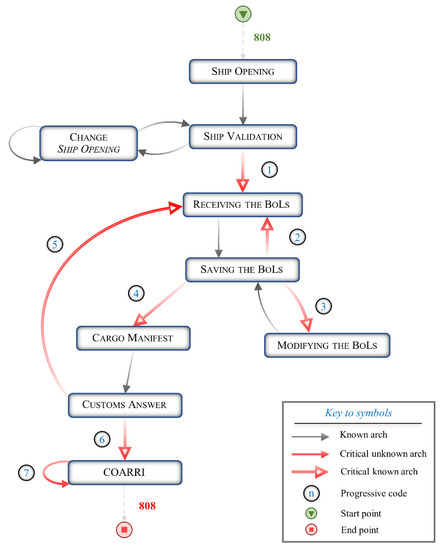 The number (808) near the start and the end points highlights that all of the considered process instances started with Ship Opening and ended with COARRI. The process map contains all of the arcs shown in the de jure model (Figure 1). The seven dark-gray arrows depict the arcs that were included in the de jure model and that, based on the CrI, are not critical to the export time performance. Arrow 7 is an unforeseen arc, not included in the de jure model and discovered by PM, that is critical. Arrows 1–6 are arcs belonging to the de jure model and that are also critical.