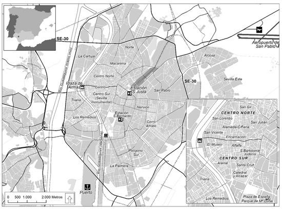 The city of Seville was chosen as the case study for this research due to its significance as a tourist destination (as is described further on) and the intensity and the speed of the recorded changes. Seville is the capital of the Autonomous Community of Andalusia (Figure 2), the most populous city in southern Spain (688,711 inhabitants in 2018, according to the Municipal Register), and Spain’s third-ranking city in tourism activity after Madrid and Barcelona.