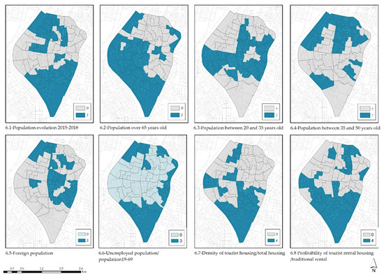 The variables in the socioeconomic block refer to groups more vulnerable due to TRH. Documents from the 8th Foessa Report [80], the Red Cross Social Vulnerability Report, or the Atlas of Urban Vulnerability [81] agree that the young population, adults between 35 and 50 years old, senior citizens, and the unemployed are the new profiles of populations vulnerable to the advance of tourist rentals.