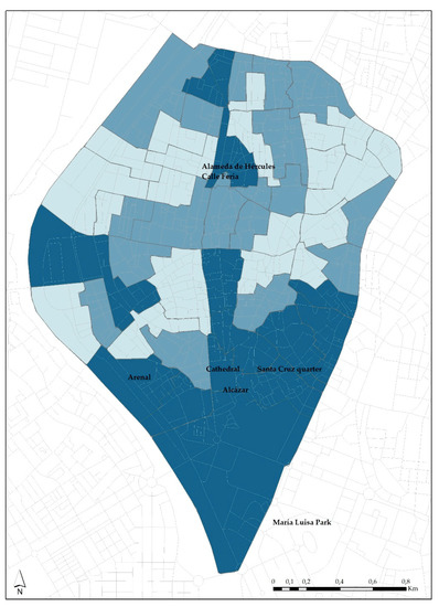 Second, and as an even more notable result due to its novelty, a second set of tracts stands out with less surface area in the northern part of the historic center (the area around Alameda de Hércules and Calle Feria). This finding is worth emphasizing because it is a traditionally depressed environment that has serious problems of urban deterioration and social exclusion but which is in the process of transforming to become a new tourist space in the city after a series of public and private renewal actions in the last two decades (as indicated in the section presenting the case of Seville). Since the beginning of the 21st century, it has become an area where the creative classes and new cultural and specialized restaurant spaces are concentrated, thus experiencing gradual gentrification. The result shown in the map indicates that, after being included in the city’s tourist circuits, it now has a large amount of TRH, whereby it is one of the spaces with higher vulnerability to the phenomenon in the entire historic center. This caused a historic break from what had been the patterns for the locations of activities in the city throughout the 20th century, and the result of the vulnerability indicator seems to portend that the phenomenon is not finished and that a gradual replacement of those creative classes (with an alternative or Bohemian orientation) and the few remaining original inhabitants by contingents of tourists lodged in rental housing can be predicted for the future.