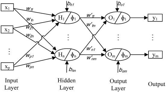 In Figure 1, a simplified structure of an MLP is shown where p numbers of inputs are connected with n numbers of hidden nodes and the hidden nodes are connected with m numbers of output nodes to generate m numbers of outputs. An MLP neural network gets trained by adjusting the connecting weights and biases in two stages [49]. The first stage propagates the inputs through hidden and output layers to predict the outputs and compare the predicted and targeted outputs for estimating their differences. This stage selects the weight and bias randomly. The second stage adjusts the connecting weights and biases by minimizing the differences between the estimated and actual outputs. The supervised learning algorithm terminates and adjusts the weights and biases while the summation of the absolute differences of the predicted and targeted outputs do not change for a pre-specified number of epochs or reaches the pre-defined maximum number of epochs.
