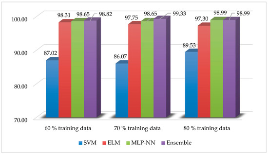 Furthermore, this study employed a majority voting ensemble method based on the outputs of the three machine learning tools to achieve better generalization performance for the testing datasets. This technique gave the same rights to each model and chose the predicted solutions that received more than half of the votes. There was no ambiguity in the selection of the best class as this study employed odd numbers (three) of MLT. Table 7 presents and compares the accuracy of the different machine learning tools and the majority voting ensemble method. Figure 2 shows the testing accuracies of the employed MLT and the majority voting ensemble method for a different amount of training and testing data. Therefore, it can be concluded that in terms accuracies, the SVM technique showed the least performance, whereas the ELM and MLP-NN showed excellent performance that justified their employment in predicting the mode choice behavior of the school-goers of the selected area of Saudi Arabia. Moreover, the majority voting ensemble method predicted the solutions with better or at least equal accuracies of the individual models.