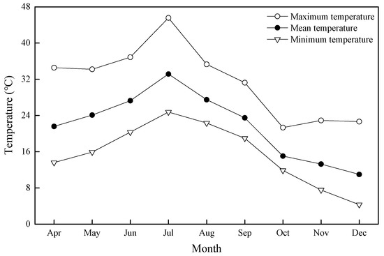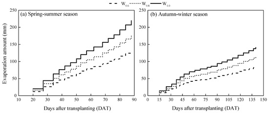 Irrigation was carried out through a bucket connected to a pump [19,20]. For each growing season, 16 and 20 irrigation events at an interval of 3–7 days were applied. Total evaporation between the two irrigation events across the two growing seasons was shown in Figure 2. Hence, a total of 30.74 and 19.80 L for W were applied for the spring-summer season and autumn-winter season, respectively.