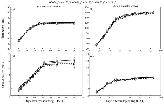Seasonal changes of tomato plant height (Figure 3a,b) and stem diameter (Figure 3c,d) with and without aeration under different irrigation levels were similar across the two growing seasons. Plant height and stem diameter presented a sharp increase before 50 DAT, while the increasing rate was relatively stable after 50 DAT. Analysis of variance indicated that, plant height and stem diameter were positively and insignificantly affected by aeration and irrigation (p > 0.05), while the effect of season on these two indexes was extremely significant (p = 0.000, Table 1). As for the plant height and stem diameter at last determination (spring-summer season: 90 DAT; autumn-winter season: 126 DAT), the maximum values were observed under W1.0O treatment. Tomato plant height was 122.1 and 162.4 cm, which was increased by 0.3–4.7% and by 0.6–3.8% than other five treatments for the spring-summer season and autumn-winter season, respectively (Figure 3a,b). Stem diameter was 12.25 and 7.47 mm, which was increased by 5.2–12% and by 0.9–6% than other five treatments for the spring-summer season and autumn-winter season, respectively (Figure 3c,d).