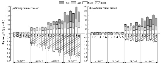 Dry weight of tomato root, stem, leaf, and fruit under aeration and high irrigation level was always greater than those under control and low irrigation level, leading to the highest values under W1.0O treatment (Figure 4). During the spring-summer season, dry weight of root, stem, and leaf on 30, 46, 68, and 90 DAT showed significant difference, and the dry weight of fruit on 90 DAT was significantly greater than that on 68 DAT (p < 0.05). During the autumn-winter season, dry weight of each tomato organ on 42 and 68 DAT was similar, and dry weight of root, stem, and leaf on 104 and 142 DAT was similar. Meanwhile, dry weight on 104 and 142 DAT were significantly higher than those on 42 and 68 DAT (p < 0.05, Figure 4).