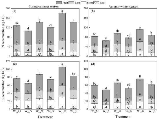 Seasonal changes of N and K accumulation in tomato organs. Different letters indicate significant differences among treatments at p < 0.05. The same as below.