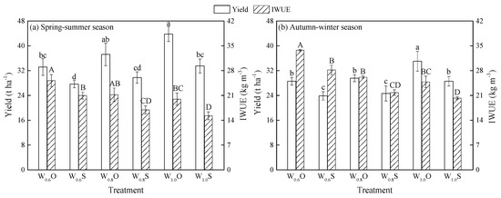 Compared to the control, significantly greater tomato yield under aeration with equal irrigation amounts applied into the soils at the same irrigation levels resulted in a significant increase in IWUE (p < 0.05, Figure 6), which was in accordance with previous results [14,19]. Additionally, IWUE under W0.6S and W0.8S was respectively 38.3% and 9.4% higher than that under W1.0S (Figure 6), which was similar to former studies [4,6,19,35]. This was probably due to the fact that stomatal closure occurred responses to water stress, and transpiration decreased more than photosynthesis under water deficit, and consequently IWUE increased [12,36]. Throughout the two growing seasons of tomato, the W0.6O treatment had the largest IWUE among the six treatments, with IWUE of 25.17 and 33.76 kg·m−3 for the spring-summer season and autumn-winter season in 2017, respectively (Figure 6).