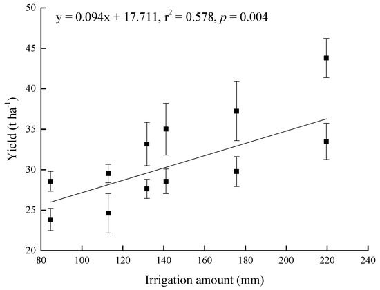 There was a significant difference in tomato yield between irrigation treatments (p < 0.05, Table 1). Compared to W1.0S, W0.6S and W0.8S decreased tomato yield by 17.0% and 12.5%, respectively (Figure 6). Similar conclusions had been drawn by previous workers [14,19]. This could be expected, because the air pathway becomes more tortuosity at higher irrigation levels, which reduces diffusion rates of soil oxygen [10]. With respect to the high irrigation level, lower yield under low irrigation level was investigated, which was primarily the result of restricted crop growth (Figure 3 and Figure 4) and reduced nutrient uptake (Figure 5). As concluded by other researchers, decreased photosynthesis and leaf transpiration rates [4], as well as reduced assimilation rate under deficit irrigation [13] could also be the cause of lower yield production. Deficit irrigation reduced water amount applied into the soils and simultaneously diminished tomato production. Tomato yield was positively and linearly correlated with irrigation amount (p = 0.004, Figure 7).