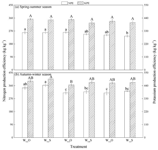 Seasonal changes of nitrogen production efficiency (NPE) and potassium production efficiency (KPE).