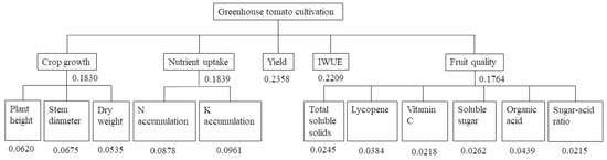 The weight of each index for the autumn-winter season, calculated by entropy method, was shown in Figure 9. Similar analytical method was adopted for the spring-summer season (data not shown). As can be seen in Table 4, a comprehensive evaluation of crop growth, nutrient uptake, yield, and IWUE during the spring-summer season from good to bad was in order of W1.0O > W0.8O > W0.6O > W1.0S > W0.8S > W0.6S, while a comprehensive evaluation when synchronously taking tomato fruit quality into account during the autumn-winter season from good to bad was in order of W1.0O > W0.6O > W0.8O > W1.0S > W0.6S > W0.8S. These results suggested that the treatment of W1.0O could be recommended as an appropriate way for greenhouse tomato cultivations when synthetically considering the trade-off amongst yield by farmers, fruit quality by customers and IWUE for sustainable development of agriculture. The result of recommended schedule management was in line with previous study when taking greenhouse effect and tomato yield into account [19]. In the following research, a comprehensive evaluation of soil-plant-atmosphere combined with economic aspects should be performed for more objectives by makers.