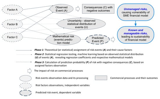 As it is depicted in Figure 2, the risk is expected to be assessed, measured and thus predicted on the basis of the defined list of certain risk factors. Each event (following above considered risk definition [] denoted by letter A in Figure 2) with negative consequences (denoted by the letter C) as the risk should be defined by certain factors which are perceived as initial, triggering risk event reasons []. The event and its factors are observed variables of any certain risk assessment framework. Observed risk factors variables work as independent and risk event prediction outcomes—as dependent variables in risk assessment models. The risk management is conceptualized here as a three-phase process. Theoretical analysis and statistical proof of risk event and its factors association are done in Phase 1. Mathematical models for risk prediction are expected to be built in Phase 2. Observed risk factors variables are processed by mathematical models and risk are predicted in Phase 3.