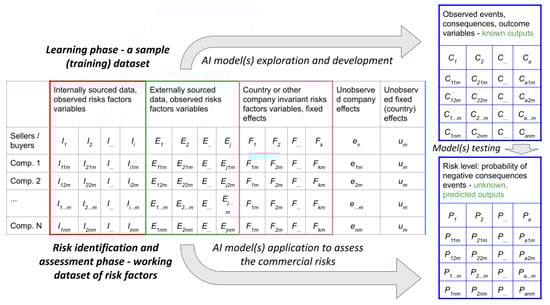 Each of the above discussed (Figure 3) commercial risk management analytical levels are characterized by a certain risk, i.e., expected events with potentially negative consequences. These events could be observed (and documented) in the company’s commercial practices and thus become outcome (i.e., dependent) variables in AI models of risk assessment, which constitute the essential body of here discussed CRMF. Outcome (observed risk events) and factor variables constitute the main CRMF database (Figure 4) used for AI machine learning, risk assessment models development and respective risk assessments.