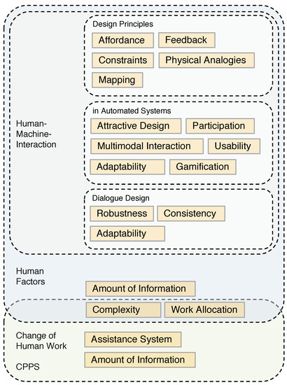 In addition to the disciplines of work design and human–machine interaction, the area of human factors also covers issues raised by the design of CPPS. Human factors can be understood as all physical, psychological, and social characteristics of the humans, which influence the action in socio-technical systems [25]. The associated scientific discipline is also referred to as human factors, and it deals with the role of humans in complex systems, the design of work equipment, and the human-oriented adaptation of the working environment [26]. On the one hand, it aims to carry out basic research in the field of the interaction between people and technology and, on the other hand, to produce solutions for practical problems. The aim is to avoid the negative consequences that can arise from this interaction. As a result, human well-being can be increased, and the safety and function of the human–machine system improved [25]. Human-oriented design of the CPPS is thereby of high importance.