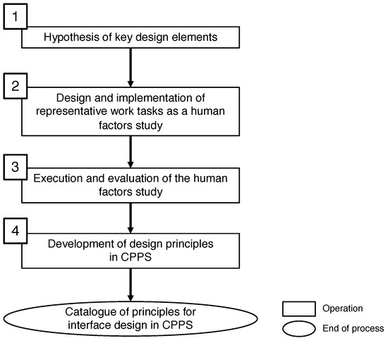 Phase 1 of the method aims at identifying the key design elements in the present cyber-physical work system. At this point, the term “key” refers to the design elements that may have a significant effect on work performance or the perception of work. The selection of these elements will be initiated by a collection of potentially important design elements for human–machine interfaces in CPPS. This collection originated from previous research in the fields of human–machine interaction and human factors as presented in Section 3.1. The collection of possible key design elements is presented in the overview (see Section 3.1). These design elements will be evaluated in the next steps of the method.