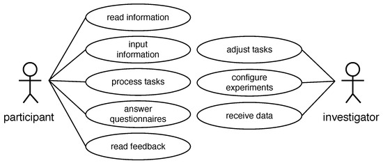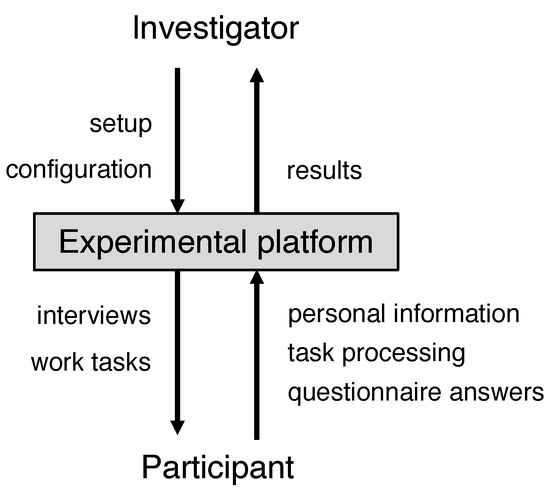 A platform needs to provide an interface to the investigator and the participant. The investigator configures the setup of the experimental platform to set up and configure the investigation. This includes the realization and customization of the work tasks, the design elements, as well as the set-up of the study. Once the experiment is finished, the experimental platform makes the recorded results available to the investigator. The test participant uses his or her interface to the system for task processing and answering of questionnaires. All entries and responses made are recorded. The described functionality of the interfaces is shown in Figure 3.