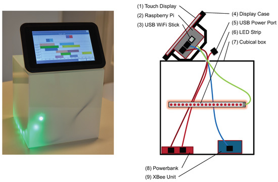 The experimental platform is based on a Raspberry Pi 2 B single board computer combined with a 7-inch touch display. Further components are shown on the right side of Figure 4 as a cross-section of the system. Due to the use of common electronic components such as a Raspberry Pi 2 B or a USB power bank, a cost-effective implementation of the experimental platform is possible. The total price of a system is 233 Euro (as of 2019). The total price is in the range of commercially available tablet computers, which can be a possible alternative to this system. Due to its modular structure, however, the platform can be flexibly extended and adapted. The use of a Raspberry Pi, for example, provides extensive connection options (e.g., for operating the LED strip). The perspex box can be used to easily accommodate additional components. Thus, the use of the experimental platform is preferred over the use of a tablet. The left side of Figure 4 shows a photo of the system.