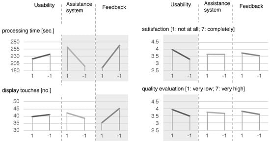 A standard method of human factors are experimental studies [32]. They can be used to show whether there are causal relationships between the design of a human–machine system and effects on the humans involved, the system, or the system performance. Therefore, in an experimental study, one or more variables are modified in order to induce observable effects [32,33]. The goal of a subsequent statistical evaluation of the experiments is to answer the question whether the selected independent variables (factors) have an influence on the dependent variables. Both descriptive and closing statistics methods are used. While the former summarizes and presents the collected data, the latter concludes whether the identified differences are significant or only the result of a random variation [33]. Descriptive statistics in the field of human factors often include the representation of mean values and standard deviations. Typically, the values of the dependent variables are determined for the respective levels of the independent variables and statements are made about their variance [33]. If there is a factorial design with several independent variables, the main effect of an independent variable and interaction effects between several independent variables can be determined [35]. For experimental designs that follow a factorial design with several independent variables in different levels, an analysis of variance (ANOVA) is often performed (if different conditions are met, see [35]). ANOVA provides a statistical test that takes into account the observed mean values of the different groups. It allows a decision to be made whether these differences are large enough to conclude that there are similar differences in the underlying populations [36].