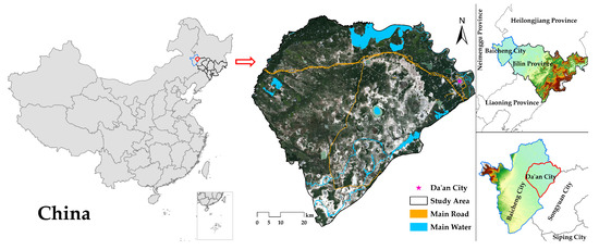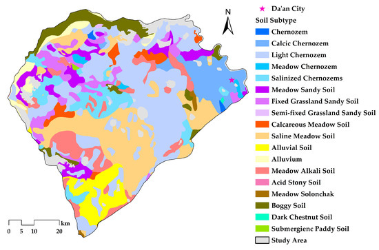 Da’an City is located in the northwest of Jilin Province, China and the hinterland of Songnen Plain, with a geographical range of 445700–454551 N and 1230845–1242156 E. Location and nearby areas of Da’an City is shown in Figure 1. The total area of the study region is approximately 4879 km2. It is a mid-temperate, semi-arid continental monsoon climate with four distinct seasons. The average daily temperature in the coldest month is −17 C, which in the warmest month is 25 C. Average annual rainfall is 413.7 mm. The terrain of the whole region is low and flat, with altitude almost in the range of 120–160 m. Soil types and distribution of Da’an City are shown in Figure 2 and Table 3. Ten types-eighteen subtypes of soil are widely distributed in the local area. Among them, chernozem and meadow soil are major types. Da’an City governs five streets, 10 towns and eight townships. Its total population is more than 390,000, of which agricultural population accounts for more than 60%. Da’an City is rich in vast waters and wetlands, providing a living environment for a large number of wildlife and rare animals. Such a living environment guarantees biodiversity and habitat diversity of local and surrounding areas, and has high natural value and ecological significance. Da’an City is an important commodity grain base in China and the famous gold corn-belt around the world. Cultivated land resources account 30% of total area and are mainly distributed in north and central, 90% of which are protected by Chinese laws. However, local per capita arable land is only about 0.52 ha. Da’an City is located in the center of the Songnen Soda saline–alkali area. Salinized land accounts for 51.49% of total area, of which moderate-severe salinized land makes up 66%. So, available farmland is seriously deficient. Meanwhile, local farmland is facing other problems, soil degradation, agricultural water restrictions, ecological environment degradation, etc. So, Da’an City is a typical area with limited agricultural resources supply. Research demand for sustainable agriculture is pressing and important.