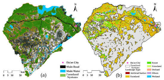 Spatial distribution and main landscape types of smallholder farmland systems in Da’an City: (a) spatial distribution; (b) main landscape types.