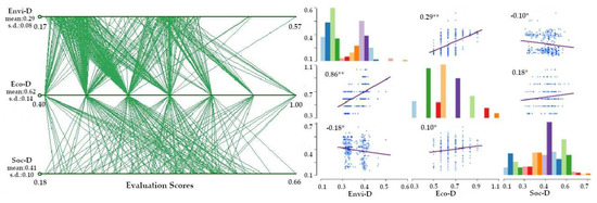 The final evaluation result of HFSAF was 3D Evaluation Scores, corresponding to Envi-D, Eco-D, and Soc-D. Spatial distribution of all smallholder farmland systems’ 3D Evaluation Scores is shown in Figure 4. Envi-D scores were generally not high, with significantly piecewise aggregation of space. Scores of partial smallholder farmland systems in south-central, south, east-central and west-central were lower, while others in north-central near waters were significantly higher. Eco-D scores had a wide range and high spatial variability, without significant spatial aggregation. Scores of fractional smallholder farmland systems in east and west which located around main traffic lines were significantly higher, while others in south–central with lack of traffic were lower. Soc-D scores were generally high and had senior spatial variability, without significant spatial aggregation. Scores of partial smallholder farmland systems in central, north-central, north-east, north-west and south were higher, while others in west-central, west and south-west were lower. From parallel coordinate axis mapping and cross scatter plot shown in Figure 5, Envi-D and Eco-D, Eco-D and Soc-D were significantly positive correlated, while Envi-D and Soc-D were significantly negative correlated.