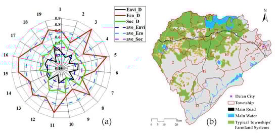 Another statistical analysis of evaluation results was made in this paper, taking townships as units. Evaluation scores of each town were used to represent average scores of smallholder farmland systems in each town. Statistical information of all townships’ 3D Evaluation Scores (see Figure 6a) revealed significant spatial differences existed among 3 dimensions. Scores of Envi-D and Eco-D had similar spatial patterns, while Eoc-D was different from them. Envi-D scores were generally lower. Scores of township 2, 4, 7, 9, 10, 12, 15, and 18 were below-average scores. These townships were mainly located in the south of east–west axis and covered most of south, south–east and south–west, having high spatial consistency with a main distribution area of saline–alkali. For Eco-D, scores were widely general. Nine townships with scores less than average score are Township 2, 4, 6, 7, 9, 10, 12, 14, and 18. These townships were mainly situated in the south of east–west axis and the west of north–south axis, far away from the center or main traffic arteries. Scores of Soc-D were universally lower. Scores of townships 2, 4, 9, 13, 14, 16, and 18 were inferior to the average score. These townships were mainly found in middle, northwest-middle and south-west, distributing in sparsely populated areas. Then townships 1 and 19 with 3D high scores, townships 10 and 14 with 3D general scores and township 4/9 with 3D lower scores (see Figure 6b) were taken as typical townships to carry out multi-level refinement analysis of results.
