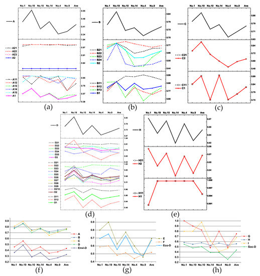 Partial statistic information of 6 typical townships’ multi-level scores in Da’an City: (a) multi-level scores of A vision; (b) multi-level scores of B vision; (c) multi-level scores of C vision; (d) multi-level scores of D vision; (e) multi-level scores of H vision; (f) multi-level scores of Envi-D; (g) multi-level scores of Eco-D; (h) multi-level scores of Soc-D.