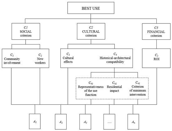 According to the existing technical-urban planning constraints and in relation to the socio-demographic and economic characteristics of the territory in which the recovery and enhancement project of the historic building is inserted, the analysts define the possible investment alternatives A1, A2, ..., An. Among these, it is necessary to make the choice that guarantees the optimal use, according to the multiple criteria C1, C2, C3 and sub-criteria C1, C2, C3, C4, C5, as well as C41, C42, and C43 defined above. The logical-operative scheme outlined finds graphic representation in Figure 1.