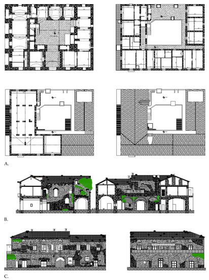 Former convent in the province of Salerno (Italy): (A). plans; (B). sections; (C). elevations.
