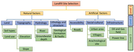The hierarchical framework for decision-making was based on expert views in multi-criteria analysis, prior research and available information in the study area [33]. The hierarchical scheme of the site selection involves three levels as presented in Figure 2.