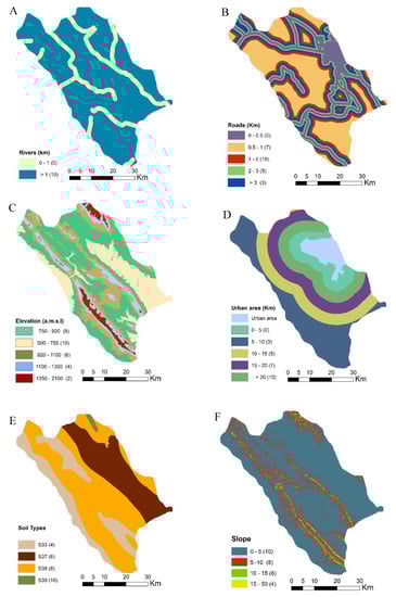 Suitability Index Maps: (A) Rivers; (B) Roads; (C) Elevation; (D) Urban area; (E) Soil types; (F) Slope.
