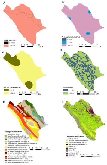 Suitability Index Maps: (A) Power lines; (B) Archaeological site; (C) Oil and gas field; (D) Villages; (E) Geological formations; (F) Land use classification.