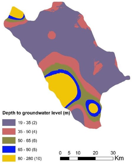 Groundwater ranges in depth from 19 to 280 m below the ground surface in most regions of the Sulaimaniyah Governorate. The landfill location should be located in an area with a deep groundwater depth in order to decrease the risk of leachate from solid waste and protect water aquifers from pollution [18,34].