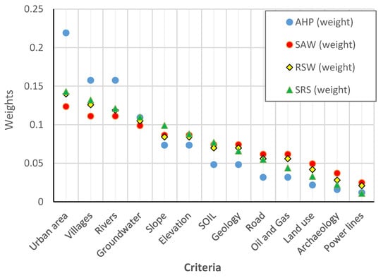 Criteria weighting based on multi-criteria decision-making methods (AHP, SAW, SRS and RSW).