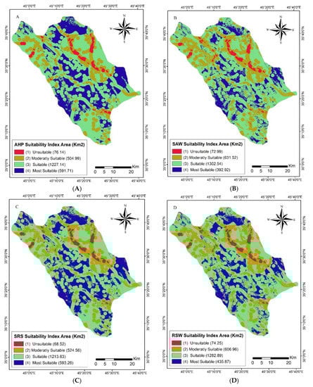 Suitability index map with area using multi-criteria decision-making (MCDM) methods (A–D).