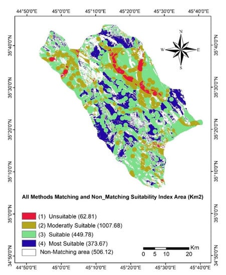 Overlay map of all MCDM methods matching and non-matching suitability index area.