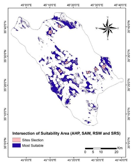 Total matching of suitable areas for all method was estimated as being 80%, while non-matching area represents 20% of the area. Thus, seven candidate sites were suggested for the landfill in the Sulaimaniyah Governorate in the “most suitable index” category according to the AHP, SAW, RSW and SRS methods, with areas of 2.74, 4.48, 2.80, 3.67, 2.67, 3.18 and 4.36 km2 respectively as shown in Figure 10. Given the expectation of huge annual waste generation of 473,000 tons over a small open dumping disposal site of about 0.45 km2 in area [58], this value needs to be more than 2.5 km2 for future planning.