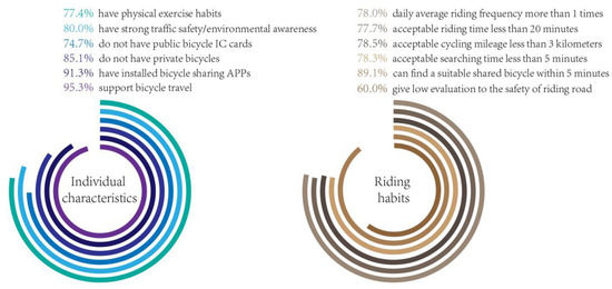 The distribution of respondents’ individual characteristics and riding habits is summarized in Table A1 and Table A2 in Appendix A. In order to more intuitively reflect the travel characteristics of college students using shared bicycles, we summarize some important travel information (such as riding frequency, acceptable riding time, acceptable cycling mileage, etc.) in Figure 1.