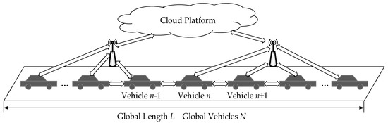 where L is the global length of a road and N is the global number of vehicles (Figure 1). denotes the ideal velocity, which is the function of the average headway and refers to the desired velocity for the uniform flow. is the optimal velocity, which depends on the headway of vehicle n and represents the desired velocity of the current vehicle. The Global Optimality can be achieved only when the velocities of all vehicles are equal to the ideal velocity. Parameter λ is the coefficient of velocity difference between the ideal velocity and the current velocity. Parameter γ is the coefficient of velocity difference between the ideal velocity and the optimal velocity. Other variables have the same meanings as that in Equations (1) to (3).