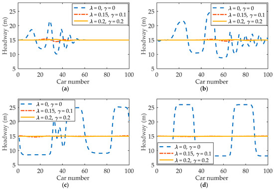 The simulation results shown in Figure 6 and Figure 7 are consistent. It is explicit that under IoV conditions, driving strategy with consideration of Global Optimality is beneficial to suppress energy dissipation. Furthermore, as parameters λ and γ increase, energy dissipation will be reduced more significantly.