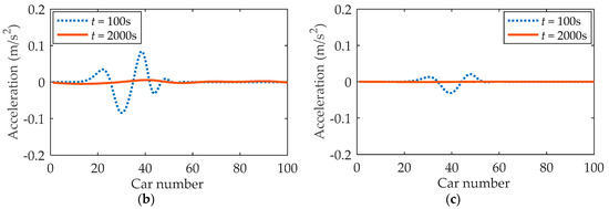 The severe acceleration fluctuation means that drivers may brake suddenly or accelerate abruptly. Such behaviors are harmful to traffic safety. Thus, the safety of traffic flow can be explored by analyzing acceleration profiles. Figure 4 displays the acceleration profiles at low sensitivity α = 1.0 under different t for the cases (a) FVD model (λ = 0, γ = 0), (b) GO-FVD model (λ = 0.15, γ = 0.1) and (c) GO-FVD model (λ = 0.2, γ = 0.2). Comparing the three cases in Figure 4, it is clear that at t = 100 s, the amplitude of acceleration for FVD model (Figure 4a) is greater than that for GO-FVD model (Figure 4b,c). Additionally, at t = 2000 s, the acceleration fluctuation is amplified for FVD model (Figure 4a) but is greatly weakened for GO-FVD model (Figure 4b,c). In particular, the accelerations of all vehicles approach to zero in Figure 4c. These simulation results indicate that Global Optimality can reduce driver’s unsafe driving behaviors such as sudden acceleration and deceleration. Furthermore, as parameters λ and γ increase separately, the safety of traffic flow will be improved correspondingly.