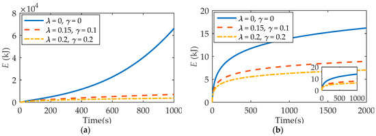 Curves for total energy dissipation E under different parameters λ and γ with different sensitivities: (a) α = 1.0 and (b) α = 2.0.