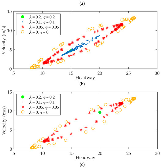 In Figure 8a, the average headway of traffic flow is 10 m. In this case, there seems to be only a single point, which means the velocities and headways of all vehicles show little difference as the values of parameters λ and γ change. In other words, Global Optimality has little effect on traffic flow when the average headway is 10 m. In Figure 8b, the average headway increases from 10 m to 15 m. The snapshots of velocity against headway form the approximate loops under certain value sets of λ and γ. It is found that the sizes of the approximate loops become progressively small with λ and γ increasing, indicating the traffic stability and safety are strengthened. As both λ and γ increase to 0.2 in Figure 8b, the loop shrinks to be only a point that represents the stable state. However, with the average headway increasing to 20 m in Figure 8c, the loop has shrunk to the stable point as both λ and γ just increase to 0.1. The results indicate that under larger average headway, Global Optimality plays a more active role in smoothing traffic.