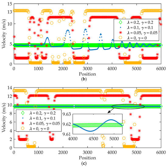 Similarly, in Figure 9a, the average headway of traffic flow is 10 m. All vehicles on the whole road have similar velocities under different λ and γ. It is explicit that Global Optimality has little effect on traffic flow in this case. From Figure 9b, where the average headway increases to 15 m, one can observe that on some road segments, for instance, the positions near 1000 m or 5000 m, the velocities of vehicles approach to zero when Global Optimality is not considered (λ = 0, γ = 0). At the same time, the velocities of vehicles on some other segments, for instance, the positions near 4000 m, are more than 13 m/s when λ = 0, γ = 0. It indicates that without consideration of Global Optimality, traffic congestion may occur in some segments while drivers on some other segments may drive at a too high velocity that is unsafe. As λ and γ increase, the minimum velocity is increased, and the maximum velocity is decreased. Correspondingly, with consideration of Global Optimality, traffic congestion is alleviated, and traffic safety is improved. Particularly, when λ = 0.2 and γ = 0.2, velocities of all vehicles evolve to 4.66 m/s which is the ideal velocity for traffic flow with average headway of 15 m. In Figure 9c, where the average headway is 20 m, velocities approach to the corresponding ideal velocity when λ and γ just increase to 0.1. The results accord with those in Figure 8.