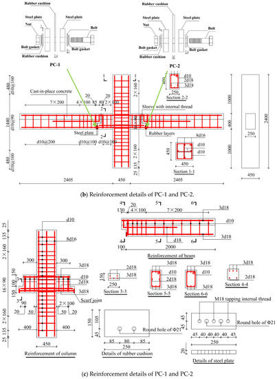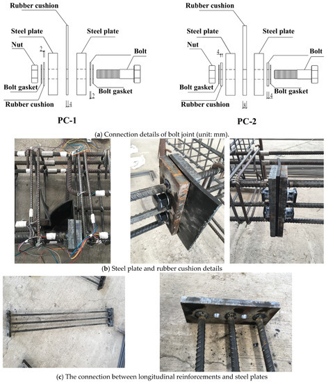 Figure 2c shows the connection details. Between the plates, flexible materials (i.e., rubber layers) are filled to make a well-distributed contact and prevent any leakage of moisture from the external environment. Besides, between the plates and bolts, flexible gaskets (i.e., rubber washers) are arranged to adjust the stiffness of beams by controlling the thickness of the rubber washers. The bolt connector should have also been used on the top of the beam if the floor slabs supported on the beam are prefabricated. The top connection details are the same as the bottom one. In this research, to simulate the composite floor slab system with the upper layer cast in-site, which is popularly applied currently, the top layer of the beam-column joint is cast together. Therefore, in this experiment, the novel bolt connector is only installed at the bottom of the joint. In this novel system the connections between main beams and secondary beams also apply the dry bolt connector, where a small corbel is attached to the main beam to support the secondary beam.