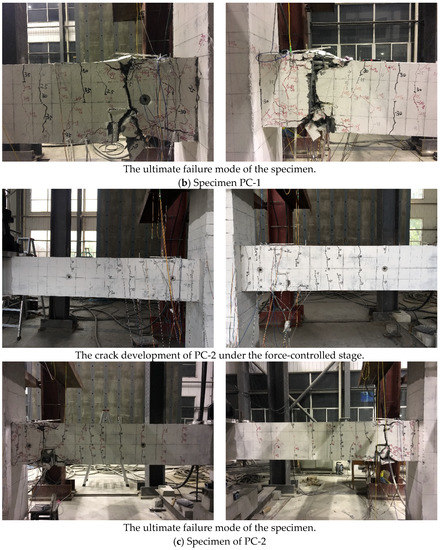 Figure 7c, the property of specimen PC-2 was similar to that of specimen PC-1. However, due to the rubber washers in PC-2 being twice as thick as those in PC-1, the deformation of the tension bolts’ position was larger. The first crack formed at the same position as PC-1 when the load reached 10 kN. The development of dominant cracks and the formation of plastic hinges were in the same place as PC-1. The cracks were more widely distributed on the beam, which was more than 1000 mm from the column face. When the displacement reached 7∆y, PC-2 reached its ultimate bearing capacity of 61 kN. Due to the rebars being weakened too much by tapping, brittle fracture happened when the displacement reached 8∆y. Therefore, the loading on the left beam was stopped. Similarly, this specimen was also destroyed in a flexural failure, and the experiment was stopped at 9∆y (i.e., at 47 kN). Compared with specimen XJ and PC-1, however, the continuous crack at the beam end did not form until the experiment finished, and no observed cracks and damages occurred at the column core region. It could be concluded that PC-2 more satisfied the “strong column, weak beam” concept.